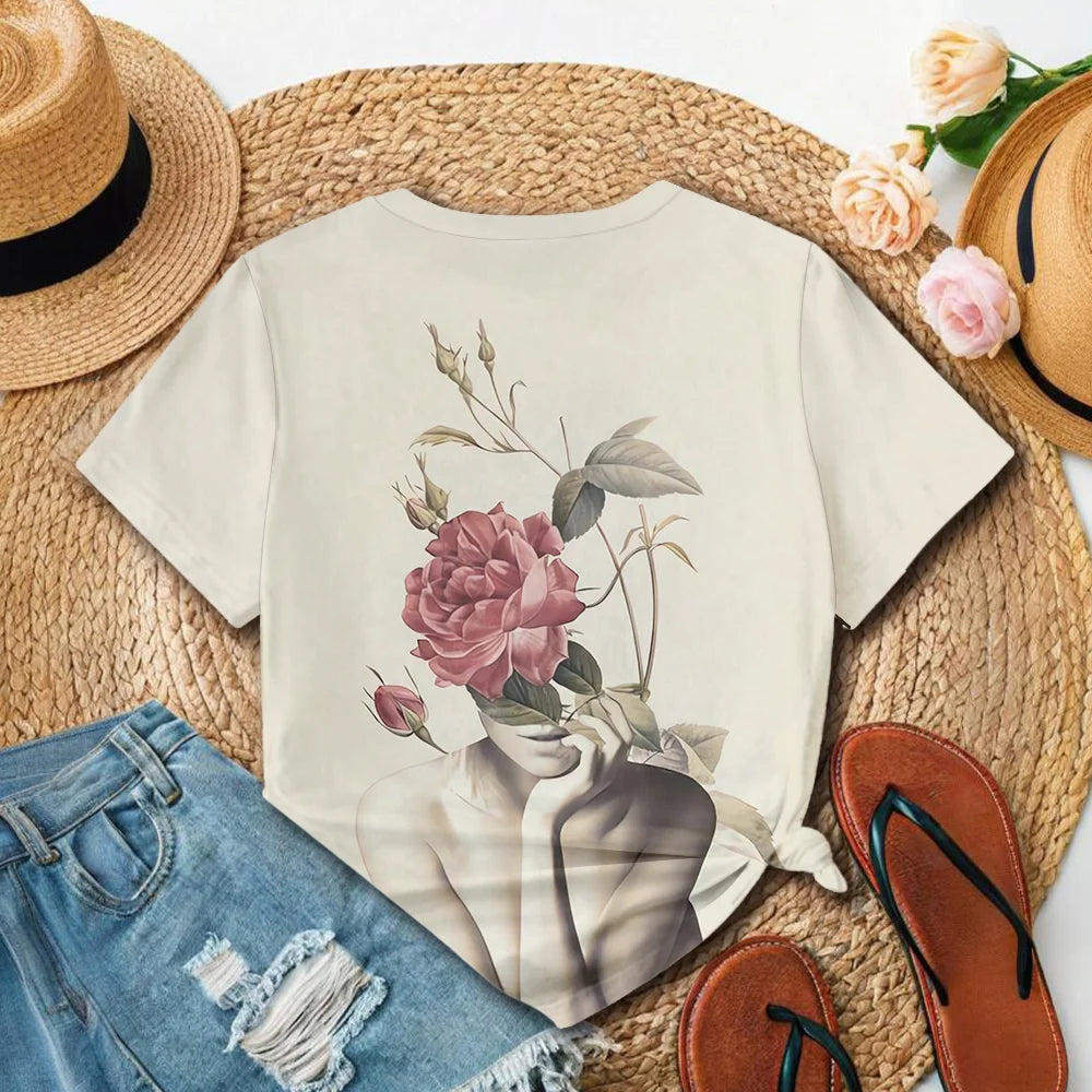 T-shirt femme avec sculpture beige et motif floral - Art Style décontracté été col rond manches courtes